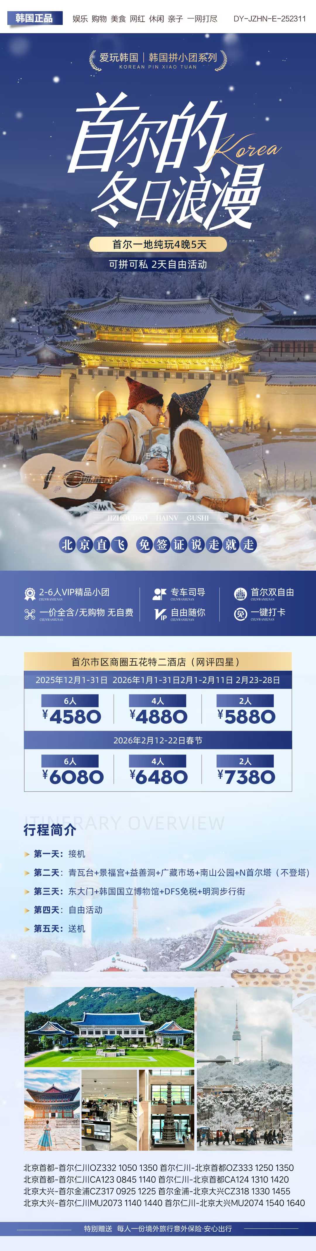 韩国拼小团 首尔冬日浪漫5天 纯玩