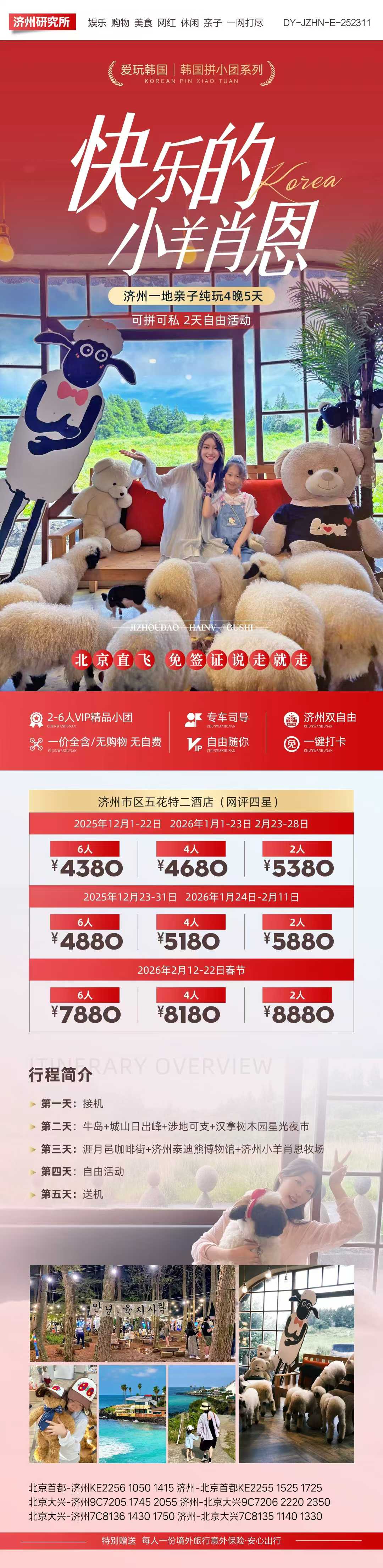 【爱玩航班】北京首都机场/大兴机场舒适航班带您畅游韩国济州岛! 【爱玩酒店】精选网评四钻市区酒店地理位置优越,交通便利,去哪里都方便! 【爱玩行程】真正纯玩行程,拒绝走马观花,多日跟团+2日纯自游活动,更深度更爱玩! 【爱玩安心】2-6人VIP精品小团 ,一价全含/无购物,无自费,优质服务,安心爱玩! 【爱玩礼包】赠送每人一份旅游意外保险安心出游!